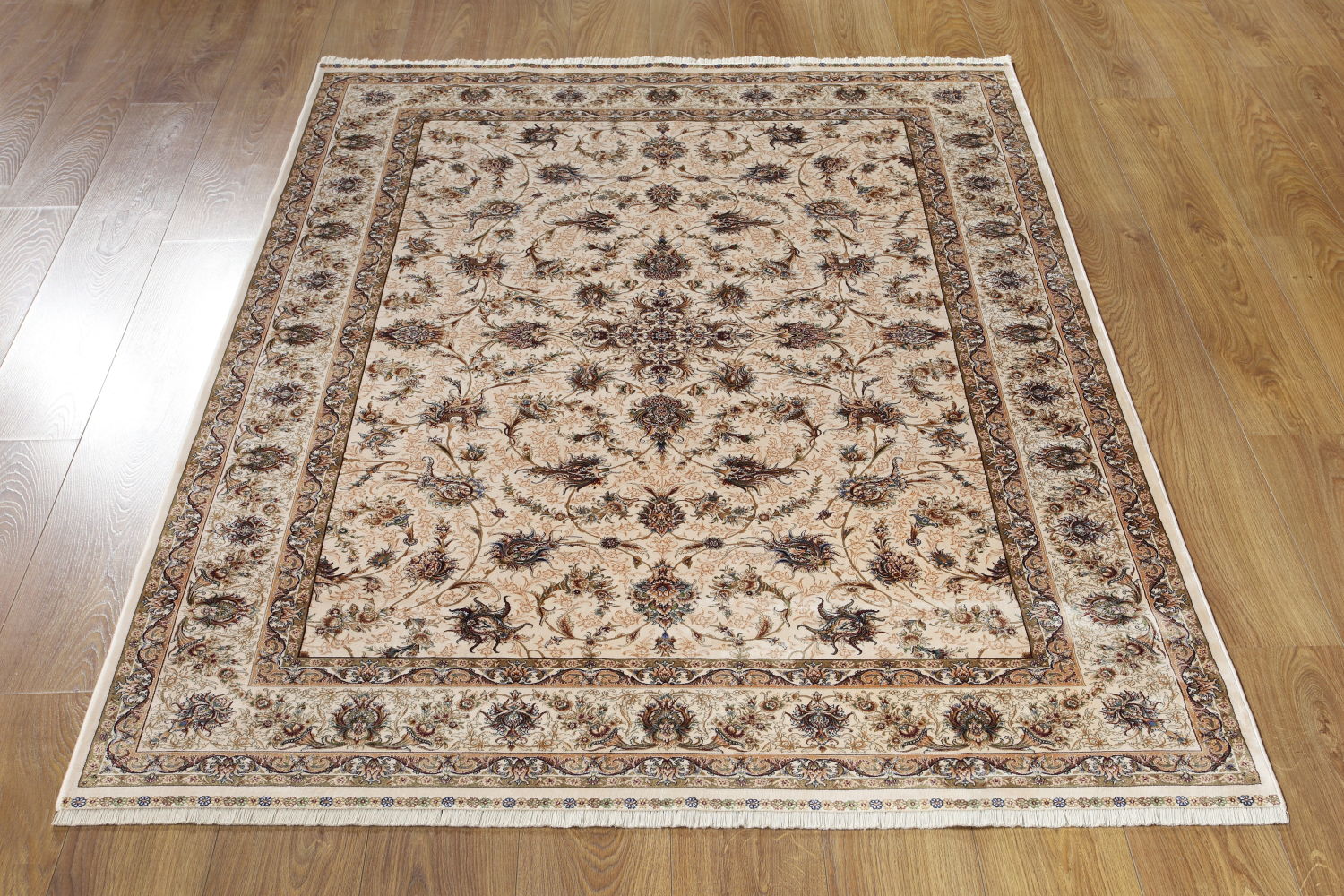 The Qum 2269A Cream-Cream rug showcases the best in modern machine production. It combines 30% natural silk with 70% modal, an eco-friendly material made from eucalyptus cellulose. This blend retains silk’s softness while improving durability. The Qum collection features a density of 3,000,000 dots per square meter. This allows for intricate patterns that rival handmade silk rugs. In many cases, it even surpasses them in softness and visual appeal. The Qum 2269A Cream-Cream rug offers luxury at an accessible price. It’s perfect for those seeking a blend of tradition and modern innovation.