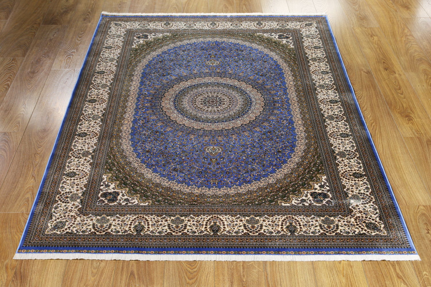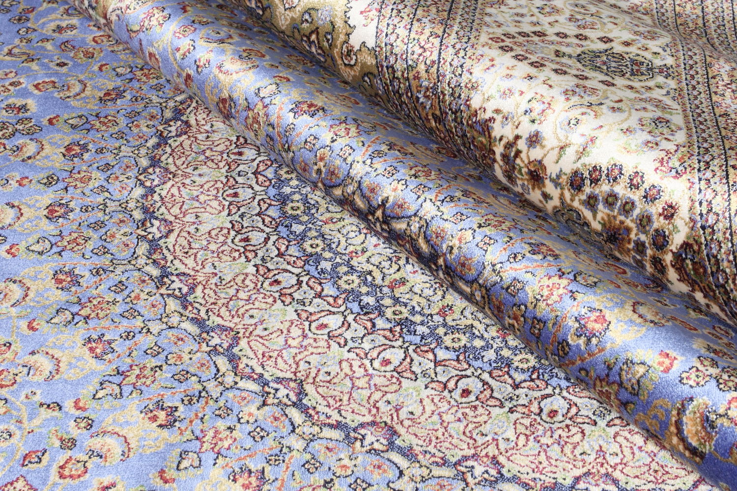 The Qum 2007D Blue-Cream rug showcases the best in modern machine production. It combines 30% natural silk with 70% modal, an eco-friendly material made from eucalyptus cellulose. This blend retains silk’s softness while improving durability. The Qum collection features a density of 3,000,000 dots per square meter. This allows for intricate patterns that rival handmade silk rugs. In many cases, it even surpasses them in softness and visual appeal. The Qum 2007D Blue-Cream rug offers luxury at an accessible price. It’s perfect for those seeking a blend of tradition and modern innovation.