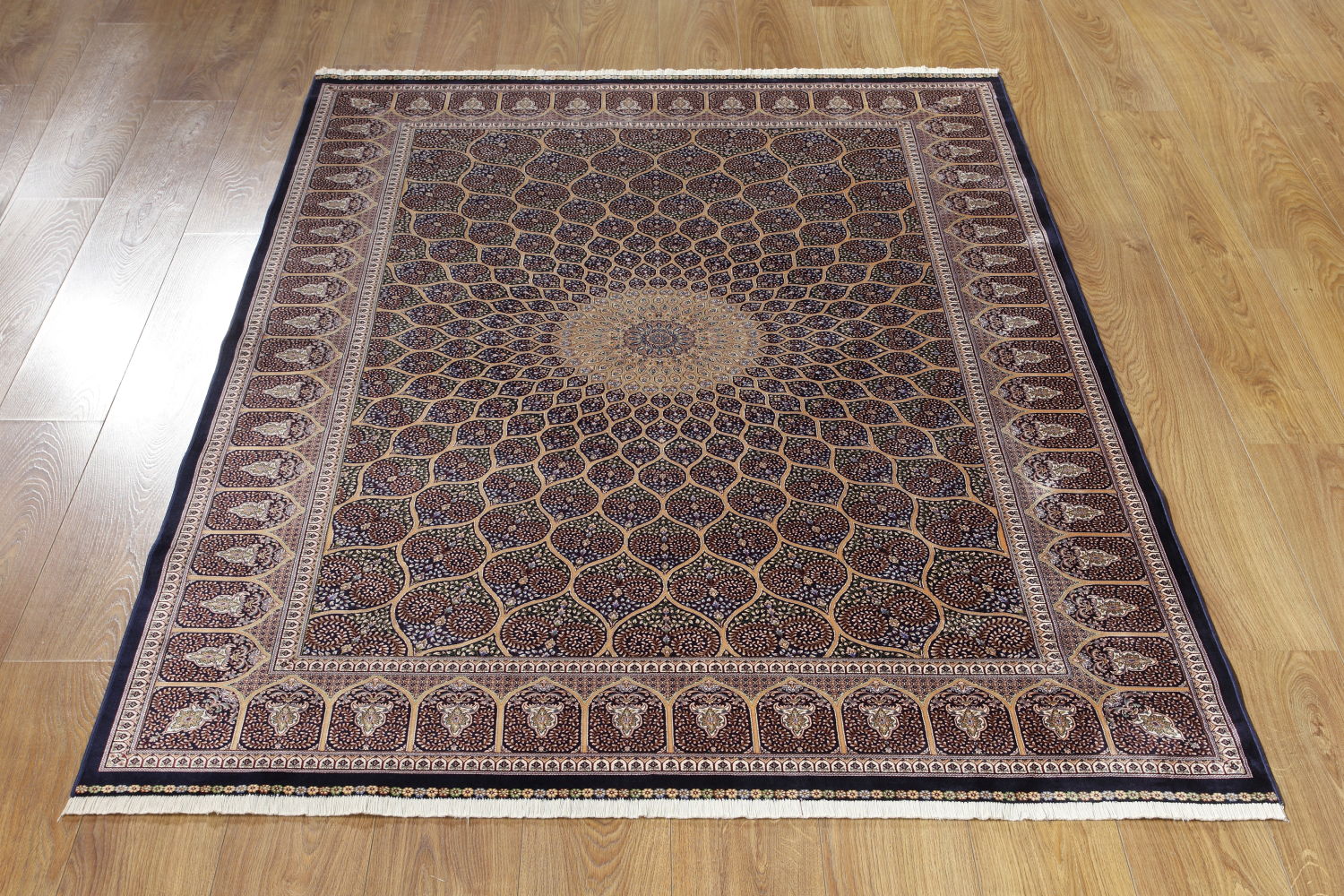 The Qum 2142Y Navy-Yellow rug showcases the best in modern machine production. It combines 30% natural silk with 70% modal, an eco-friendly material made from eucalyptus cellulose. This blend retains silk’s softness while improving durability. The Qum collection features a density of 3,000,000 dots per square meter. This allows for intricate patterns that rival handmade silk rugs. In many cases, it even surpasses them in softness and visual appeal. The Qum 2142Y Navy-Yellow rug offers luxury at an accessible price. It’s perfect for those seeking a blend of tradition and modern innovation.